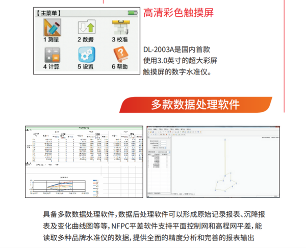 是南方首款高精度彩屏触摸屏数字水准仪,全新设计,密封防尘防水,操作简便,外形美观,满足国家一至四等水准测量及精密沉降观测等应用。